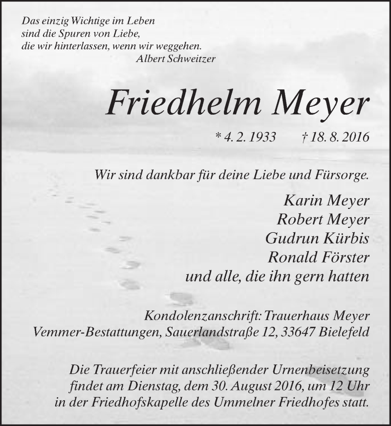 Hier finden Sie alle Traueranzeigen aus der Zeitung, die bisher für Friedhelm Meyer erschienen sind. Weitere Traueranzeigen, die in der Zeitung erscheinen, werden hier ebenfalls aufgelistet