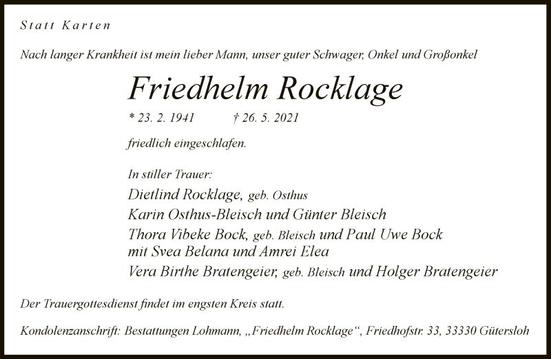Hier finden Sie alle Traueranzeigen aus der Zeitung, die bisher für Friedhelm Rocklage erschienen sind. Weitere Traueranzeigen, die in der Zeitung erscheinen, werden hier ebenfalls aufgelistet