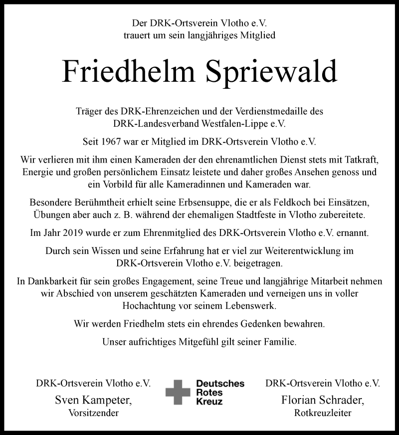 Hier finden Sie alle Traueranzeigen aus der Zeitung, die bisher für Friedhelm Spriewald erschienen sind. Weitere Traueranzeigen, die in der Zeitung erscheinen, werden hier ebenfalls aufgelistet