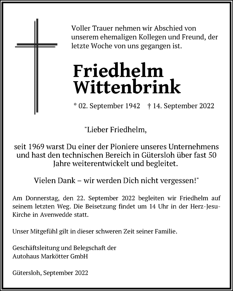 Hier finden Sie alle Traueranzeigen aus der Zeitung, die bisher für Friedhelm Wittenbrink erschienen sind. Weitere Traueranzeigen, die in der Zeitung erscheinen, werden hier ebenfalls aufgelistet