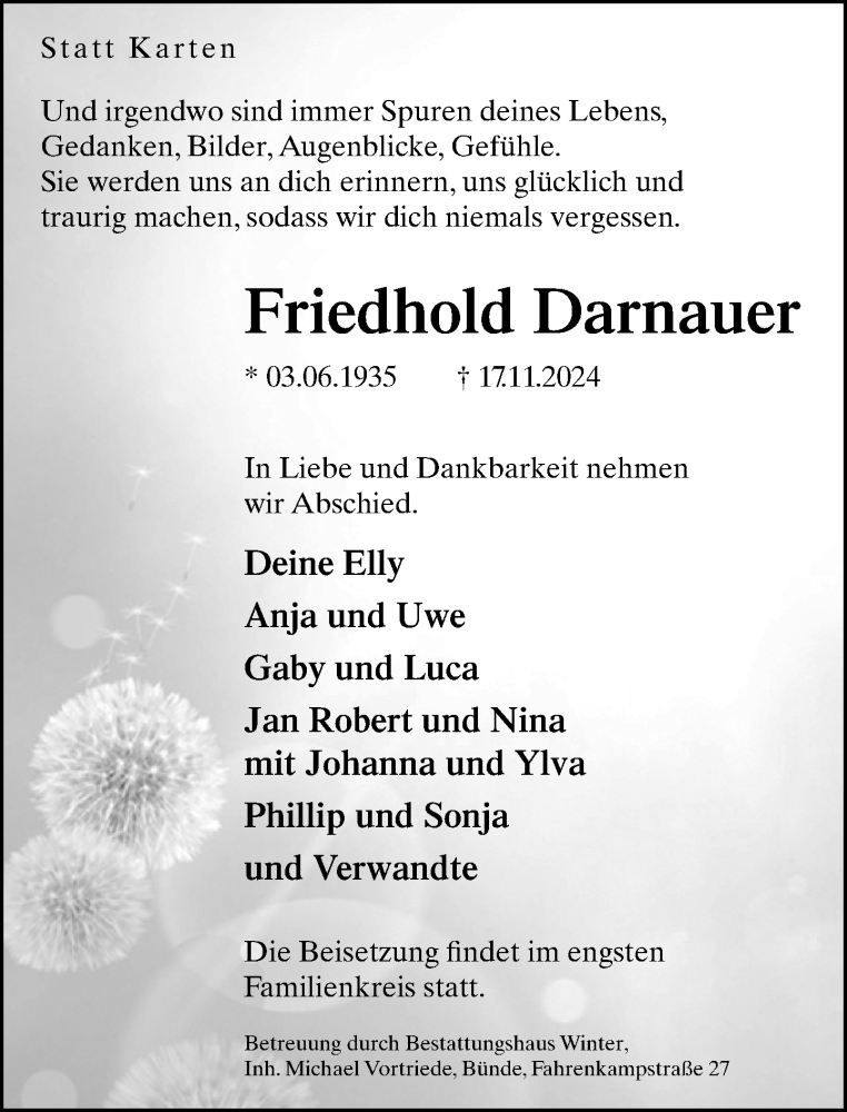 Hier finden Sie alle Traueranzeigen aus der Zeitung, die bisher für Friedhold Darnauer erschienen sind. Weitere Traueranzeigen, die in der Zeitung erscheinen, werden hier ebenfalls aufgelistet