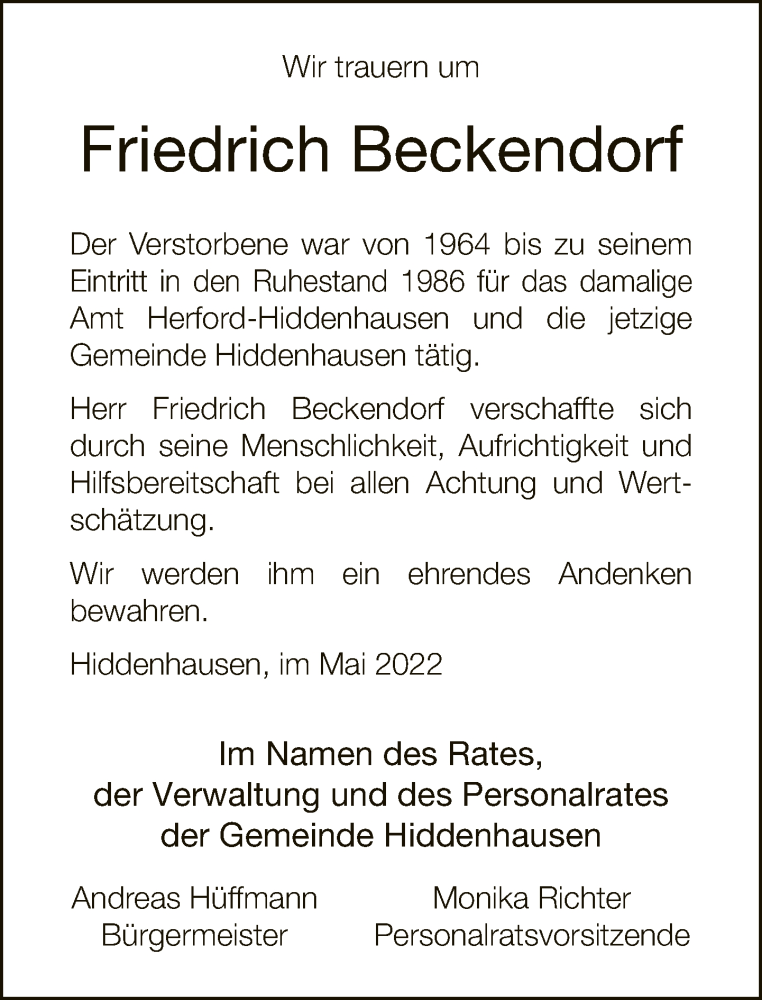 Hier finden Sie alle Traueranzeigen aus der Zeitung, die bisher für Friedrich Beckendorf erschienen sind. Weitere Traueranzeigen, die in der Zeitung erscheinen, werden hier ebenfalls aufgelistet