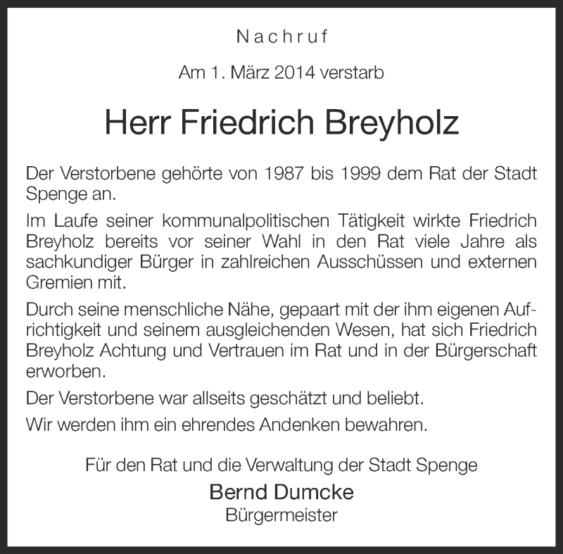 Hier finden Sie alle Traueranzeigen aus der Zeitung, die bisher für Friedrich Breyholz erschienen sind. Weitere Traueranzeigen, die in der Zeitung erscheinen, werden hier ebenfalls aufgelistet
