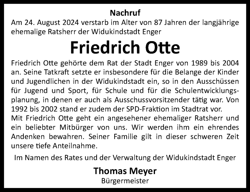 Hier finden Sie alle Traueranzeigen aus der Zeitung, die bisher für Friedrich Otte erschienen sind. Weitere Traueranzeigen, die in der Zeitung erscheinen, werden hier ebenfalls aufgelistet