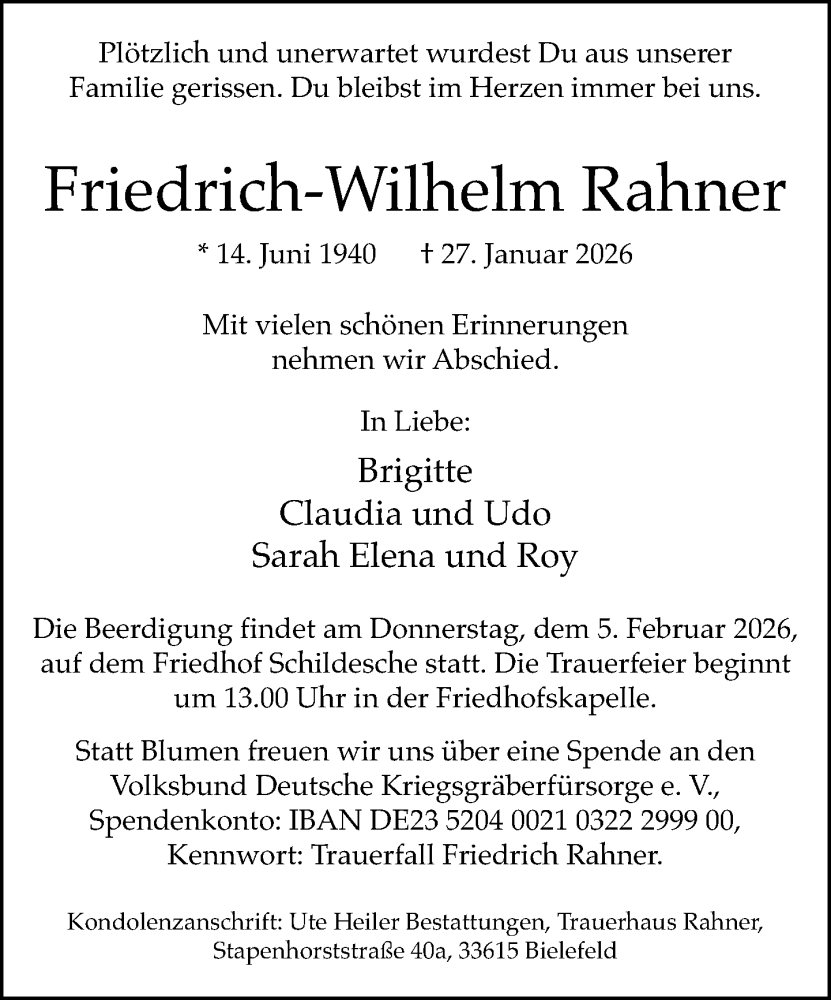 Hier finden Sie alle Traueranzeigen aus der Zeitung, die bisher für Friedrich-Wilhelm Rahner erschienen sind. Weitere Traueranzeigen, die in der Zeitung erscheinen, werden hier ebenfalls aufgelistet
