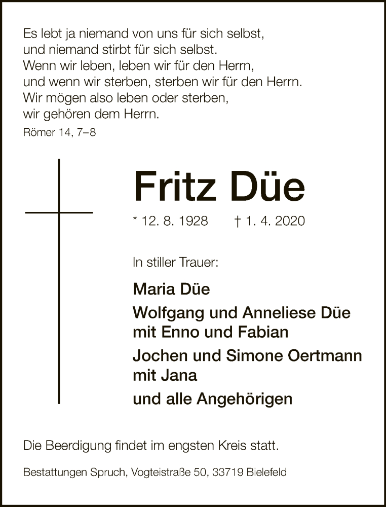 Hier finden Sie alle Traueranzeigen aus der Zeitung, die bisher für Fritz Düe erschienen sind. Weitere Traueranzeigen, die in der Zeitung erscheinen, werden hier ebenfalls aufgelistet