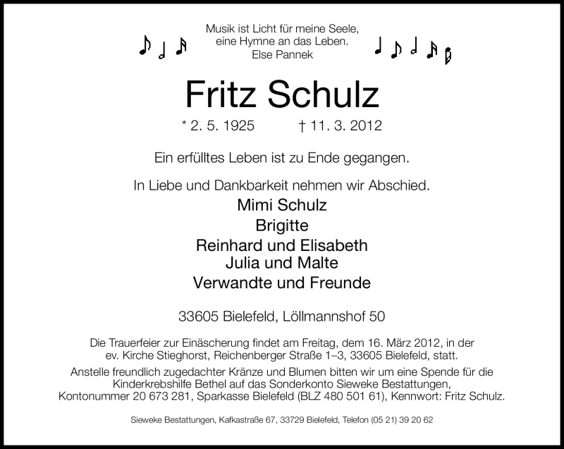Hier finden Sie alle Traueranzeigen aus der Zeitung, die bisher für Fritz Schulz erschienen sind. Weitere Traueranzeigen, die in der Zeitung erscheinen, werden hier ebenfalls aufgelistet