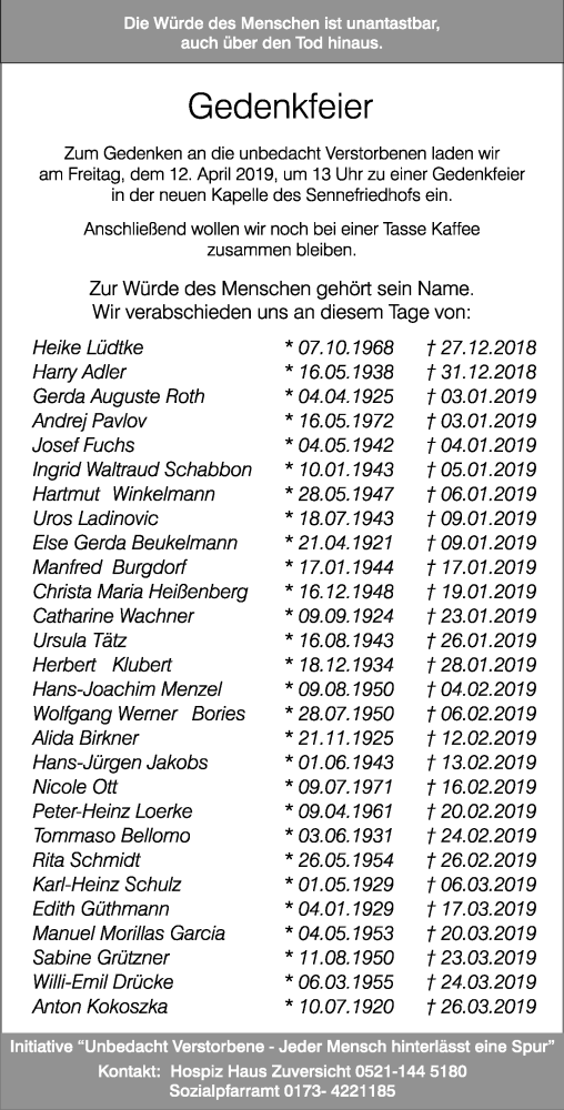 Hier finden Sie alle Traueranzeigen aus der Zeitung, die bisher für Gedenkfeier erschienen sind. Weitere Traueranzeigen, die in der Zeitung erscheinen, werden hier ebenfalls aufgelistet