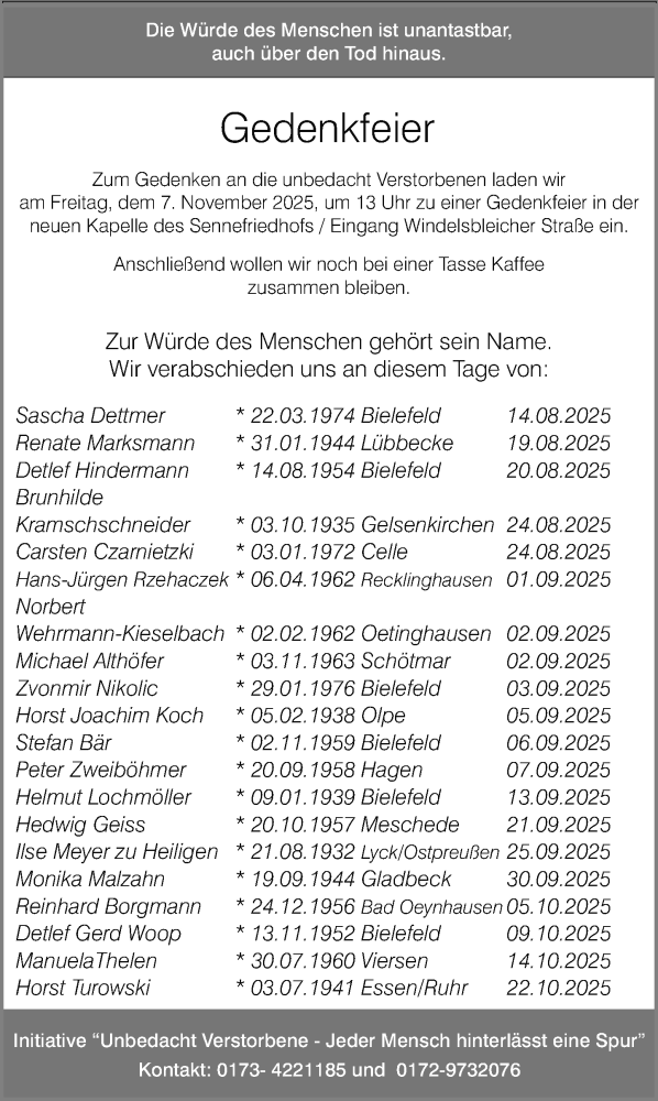 Hier finden Sie alle Traueranzeigen aus der Zeitung, die bisher für Gedenkfeier am 07. November 2025 erschienen sind. Weitere Traueranzeigen, die in der Zeitung erscheinen, werden hier ebenfalls aufgelistet
