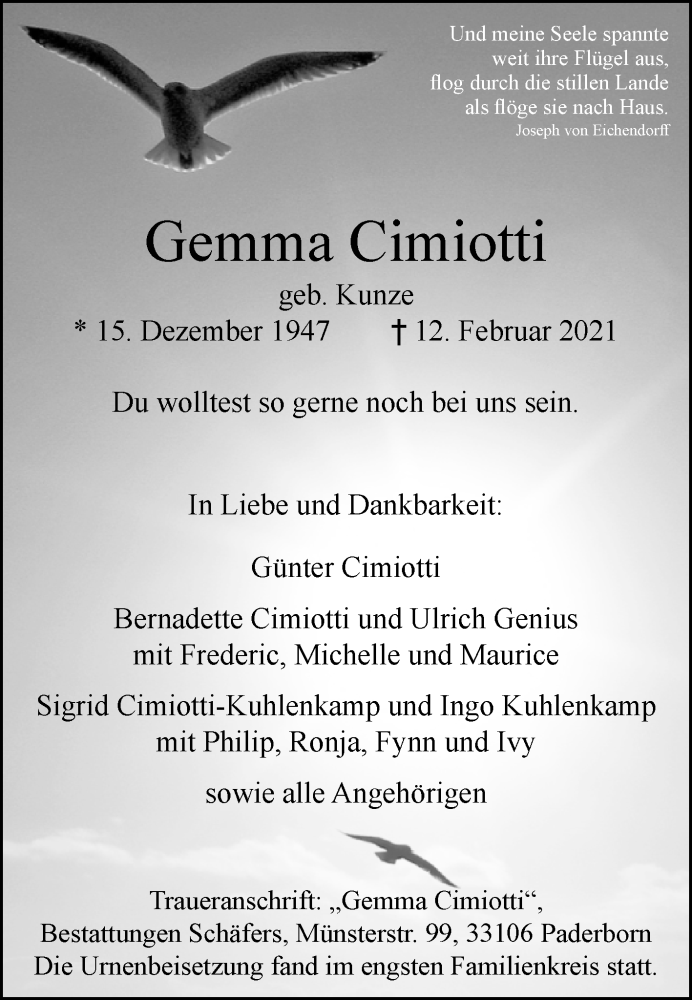 Hier finden Sie alle Traueranzeigen aus der Zeitung, die bisher für Gemma Cimiotti erschienen sind. Weitere Traueranzeigen, die in der Zeitung erscheinen, werden hier ebenfalls aufgelistet
