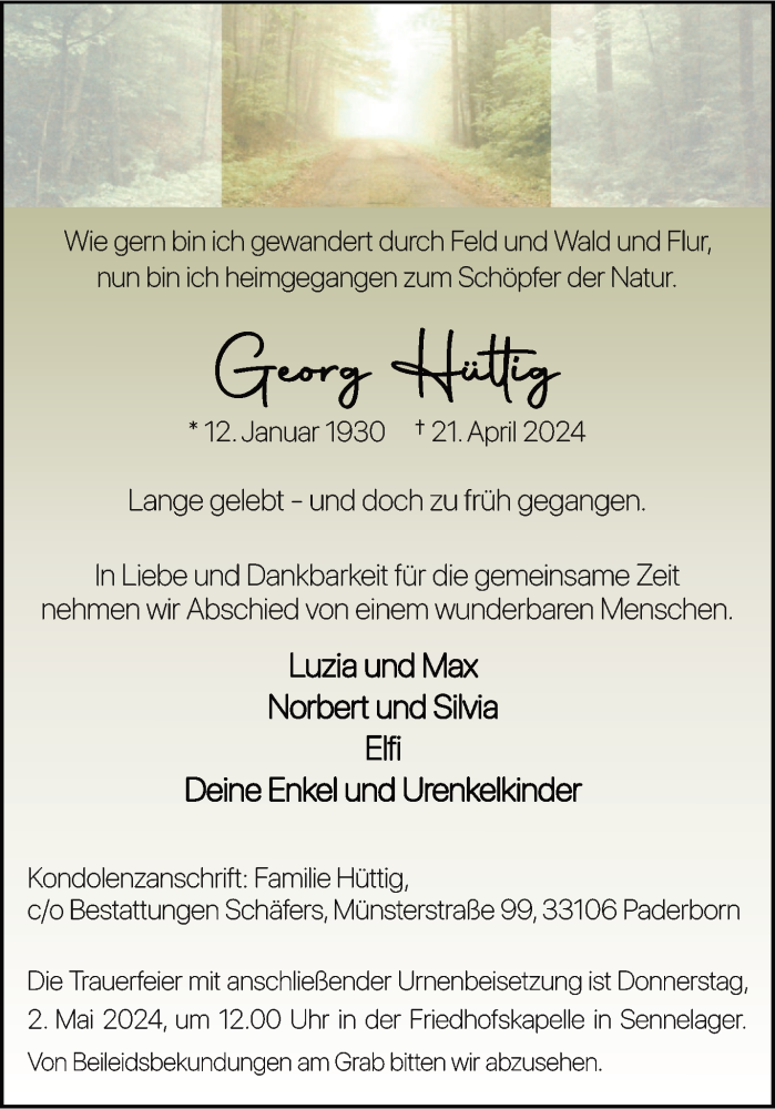 Hier finden Sie alle Traueranzeigen aus der Zeitung, die bisher für Georg Hüttig erschienen sind. Weitere Traueranzeigen, die in der Zeitung erscheinen, werden hier ebenfalls aufgelistet