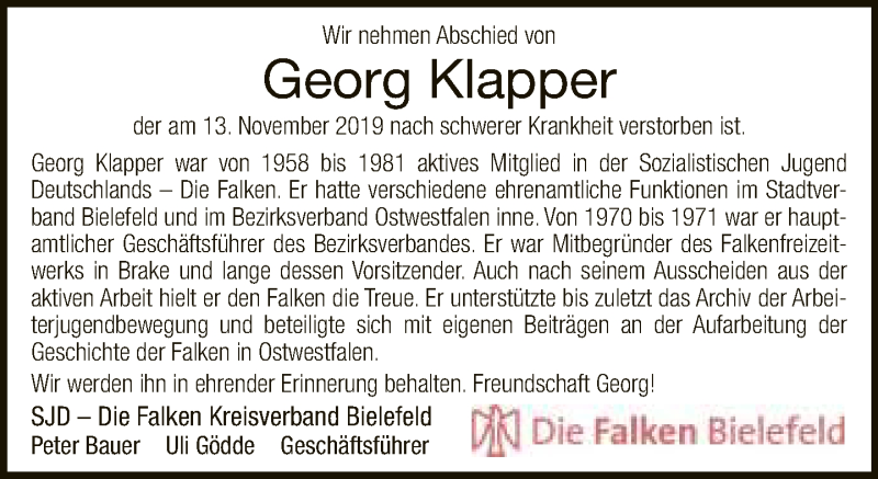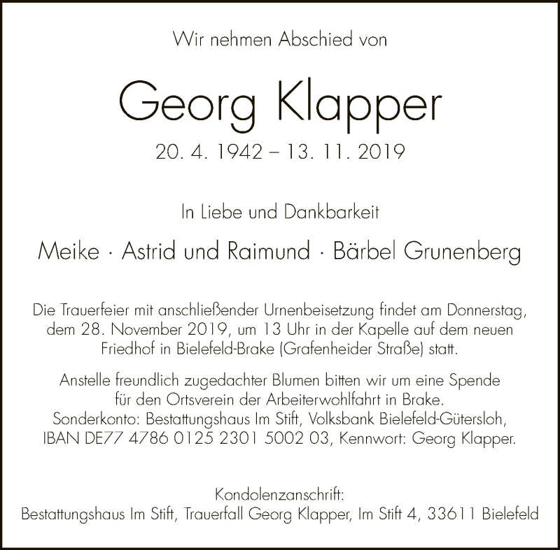 Hier finden Sie alle Traueranzeigen aus der Zeitung, die bisher für Georg Klapper erschienen sind. Weitere Traueranzeigen, die in der Zeitung erscheinen, werden hier ebenfalls aufgelistet
