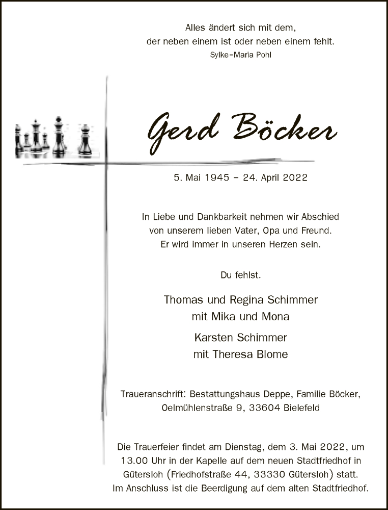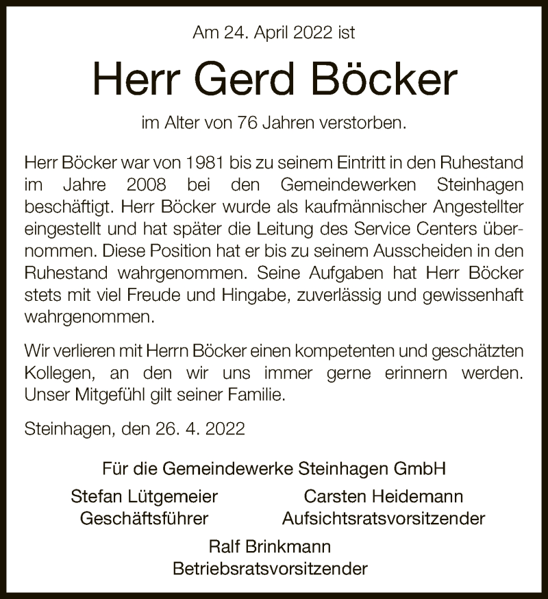 Hier finden Sie alle Traueranzeigen aus der Zeitung, die bisher für Gerd Böcker erschienen sind. Weitere Traueranzeigen, die in der Zeitung erscheinen, werden hier ebenfalls aufgelistet