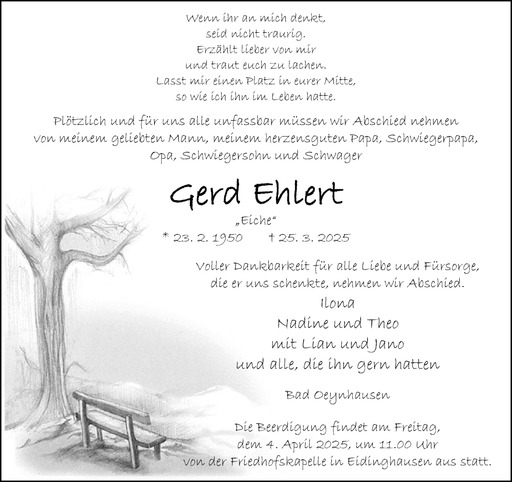 Hier finden Sie alle Traueranzeigen aus der Zeitung, die bisher für Gerd Ehlert erschienen sind. Weitere Traueranzeigen, die in der Zeitung erscheinen, werden hier ebenfalls aufgelistet
