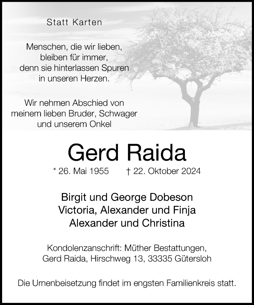 Hier finden Sie alle Traueranzeigen aus der Zeitung, die bisher für Gerd Raida erschienen sind. Weitere Traueranzeigen, die in der Zeitung erscheinen, werden hier ebenfalls aufgelistet