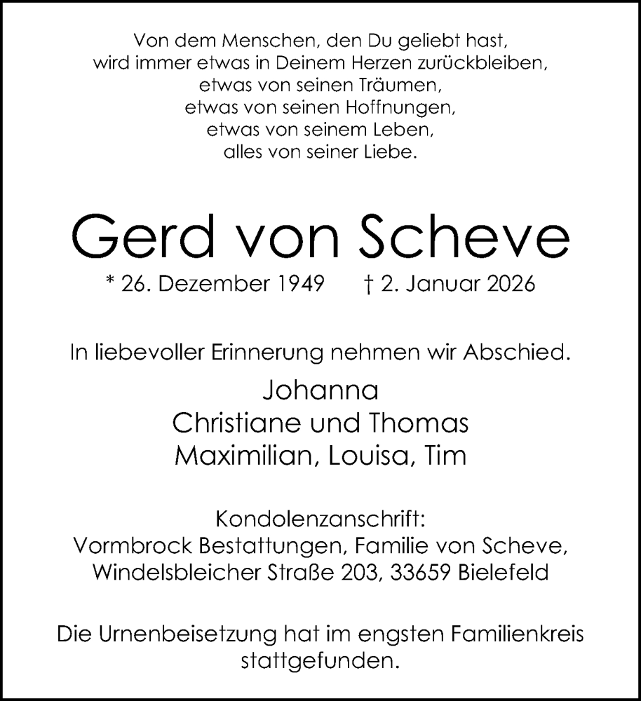 Hier finden Sie alle Traueranzeigen aus der Zeitung, die bisher für Gerd von Scheve erschienen sind. Weitere Traueranzeigen, die in der Zeitung erscheinen, werden hier ebenfalls aufgelistet