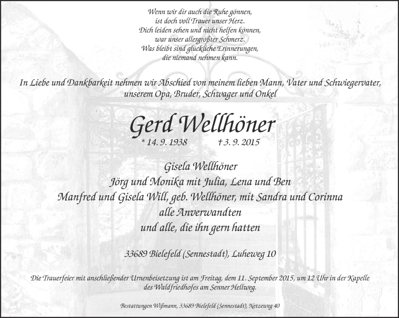 Hier finden Sie alle Traueranzeigen aus der Zeitung, die bisher für Gerd Wellhöner erschienen sind. Weitere Traueranzeigen, die in der Zeitung erscheinen, werden hier ebenfalls aufgelistet