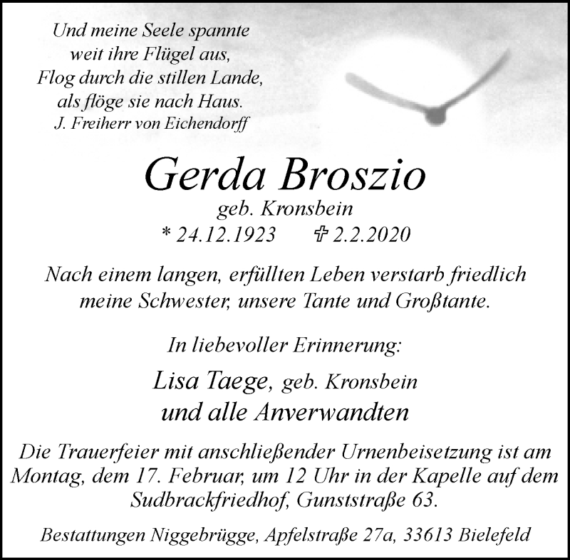 Hier finden Sie alle Traueranzeigen aus der Zeitung, die bisher für Gerda Broszio erschienen sind. Weitere Traueranzeigen, die in der Zeitung erscheinen, werden hier ebenfalls aufgelistet