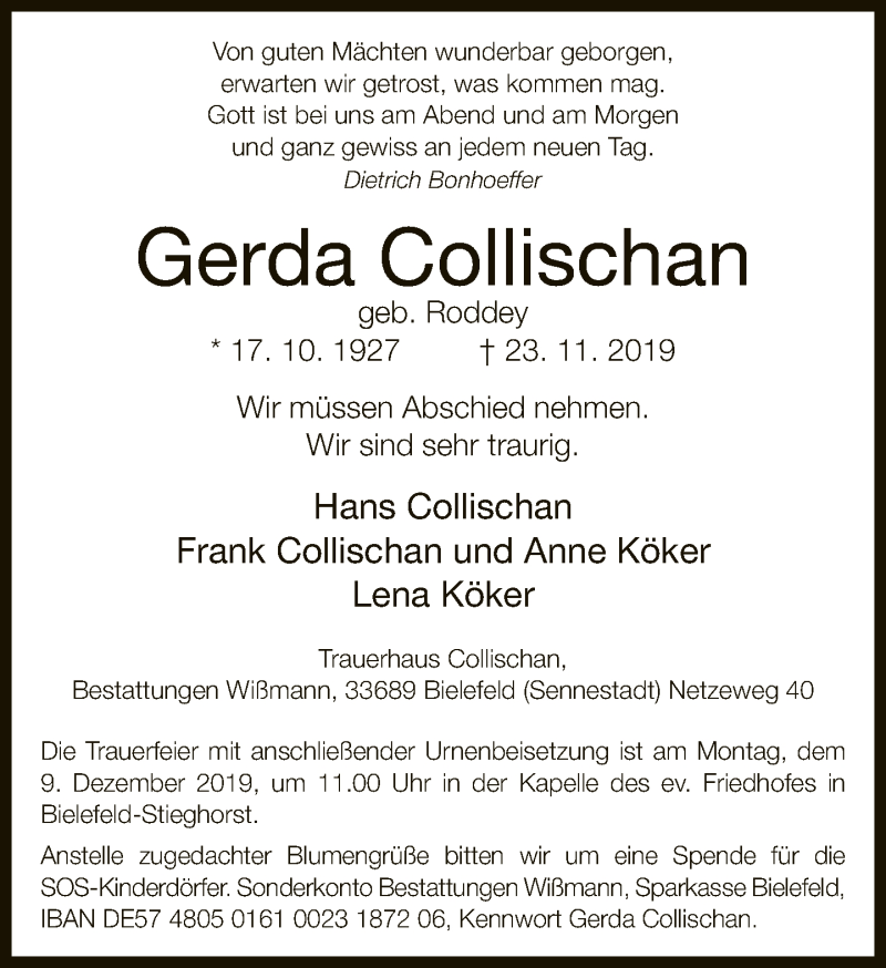 Hier finden Sie alle Traueranzeigen aus der Zeitung, die bisher für Gerda Collischan erschienen sind. Weitere Traueranzeigen, die in der Zeitung erscheinen, werden hier ebenfalls aufgelistet