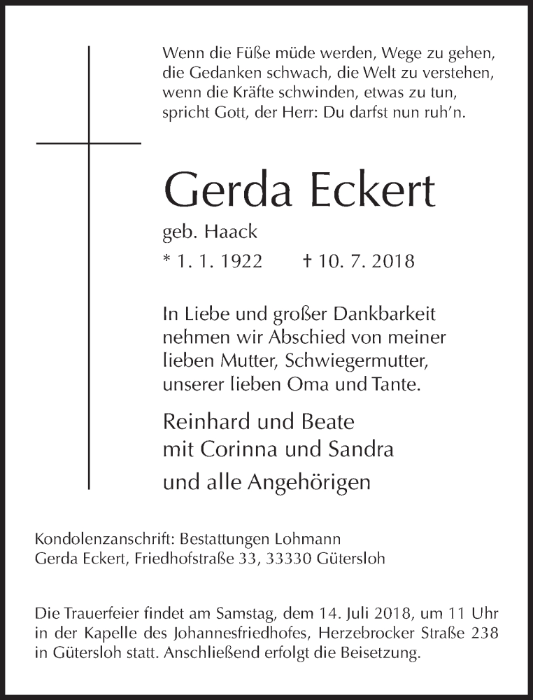 Hier finden Sie alle Traueranzeigen aus der Zeitung, die bisher für Gerda Eckert erschienen sind. Weitere Traueranzeigen, die in der Zeitung erscheinen, werden hier ebenfalls aufgelistet