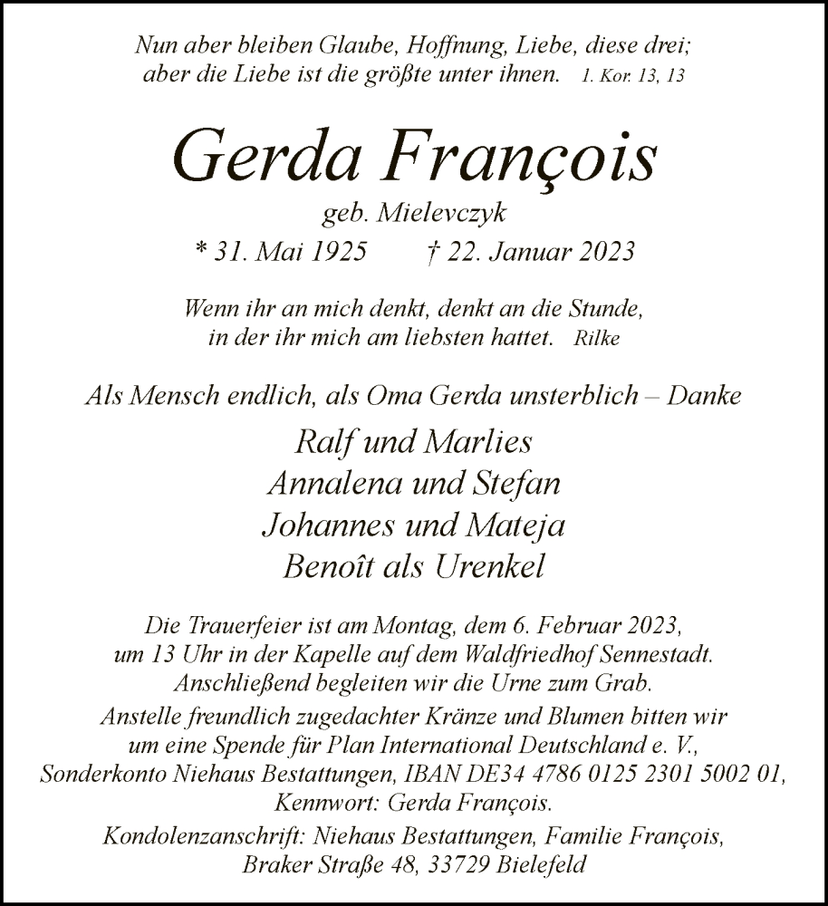 Hier finden Sie alle Traueranzeigen aus der Zeitung, die bisher für Gerda Francois erschienen sind. Weitere Traueranzeigen, die in der Zeitung erscheinen, werden hier ebenfalls aufgelistet