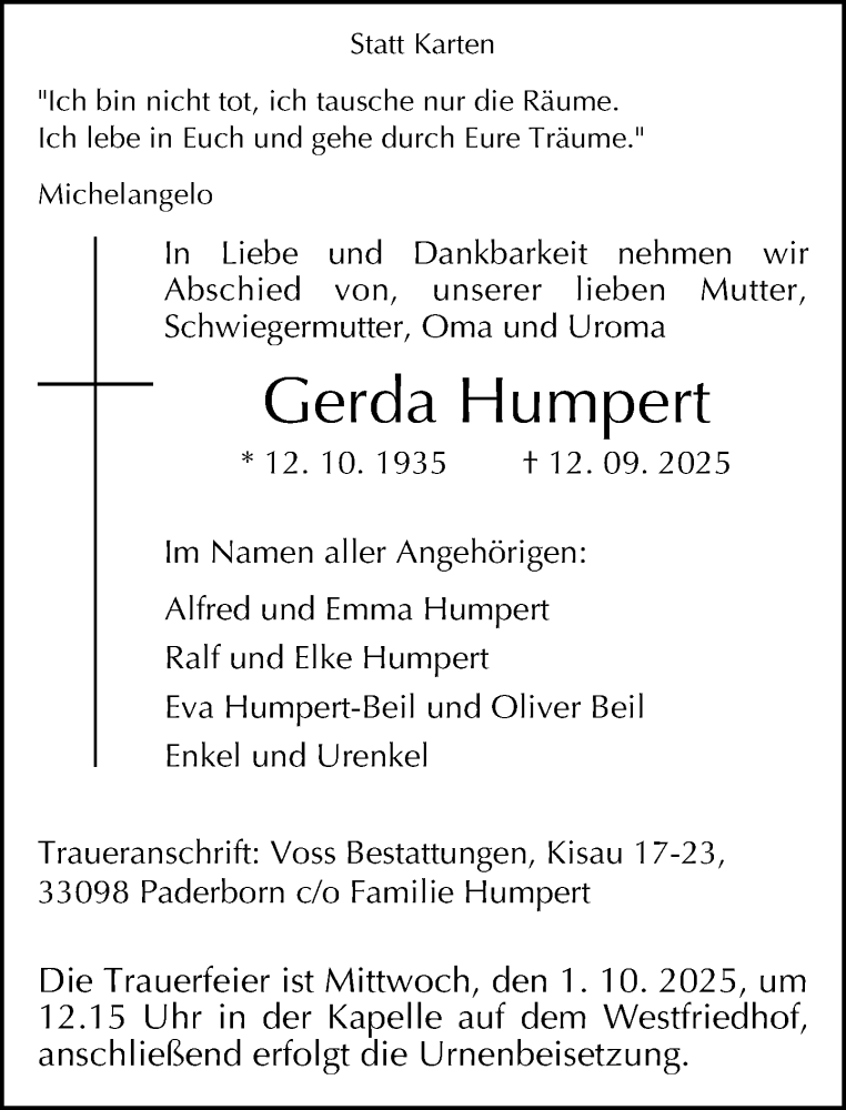 Hier finden Sie alle Traueranzeigen aus der Zeitung, die bisher für Gerda Humpert erschienen sind. Weitere Traueranzeigen, die in der Zeitung erscheinen, werden hier ebenfalls aufgelistet