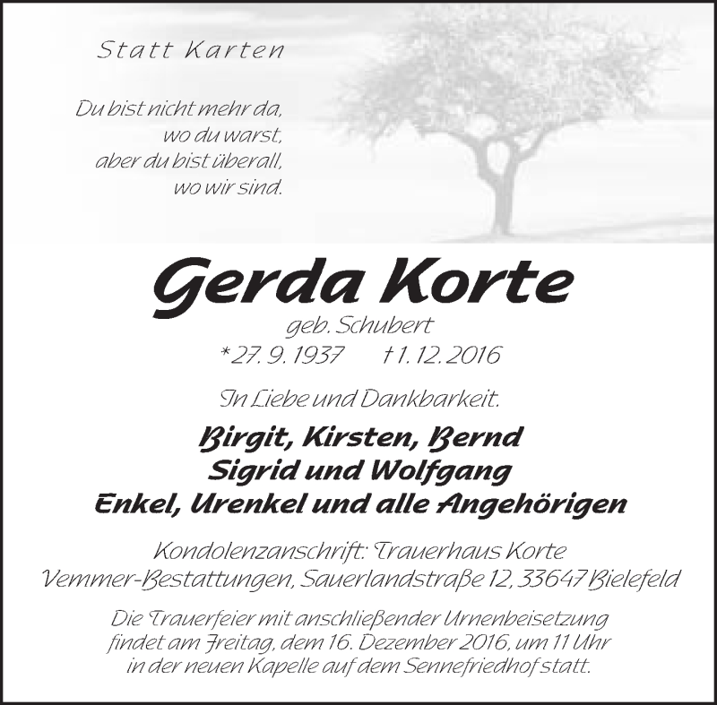 Hier finden Sie alle Traueranzeigen aus der Zeitung, die bisher für Gerda Korte erschienen sind. Weitere Traueranzeigen, die in der Zeitung erscheinen, werden hier ebenfalls aufgelistet