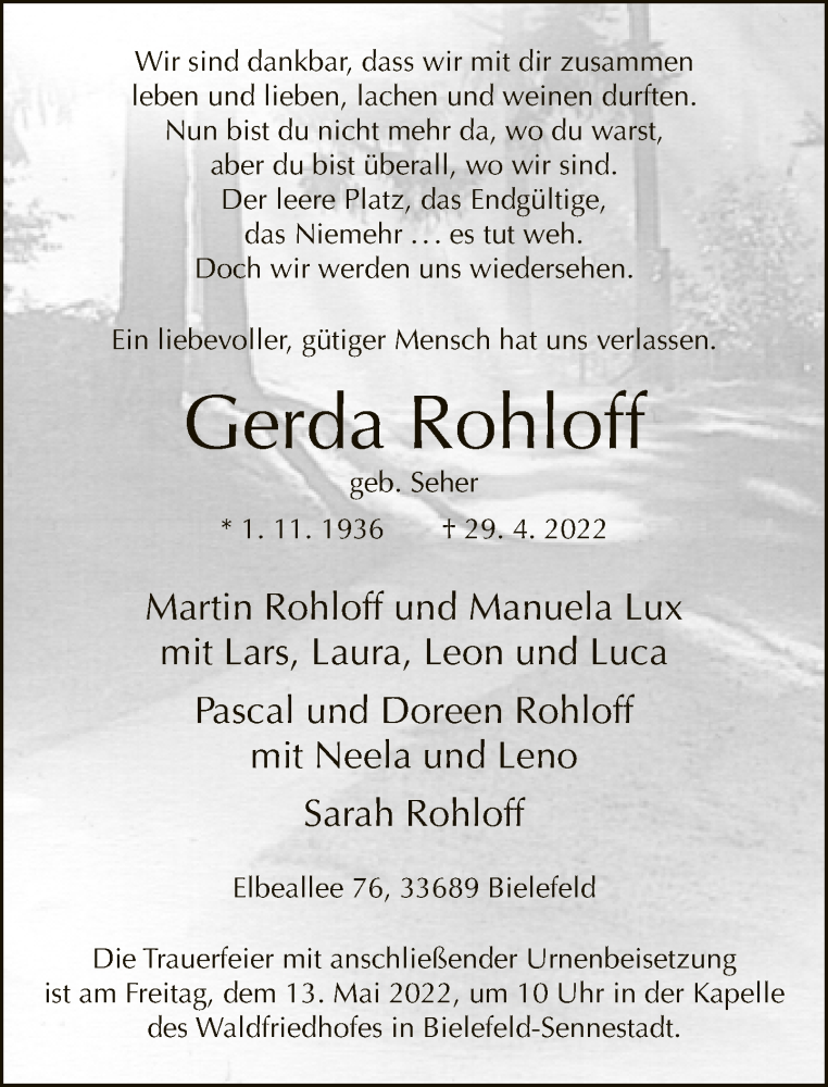 Hier finden Sie alle Traueranzeigen aus der Zeitung, die bisher für Gerda Rohloff erschienen sind. Weitere Traueranzeigen, die in der Zeitung erscheinen, werden hier ebenfalls aufgelistet