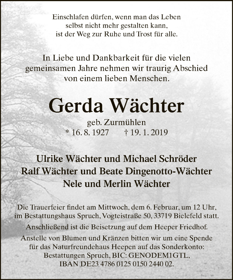 Hier finden Sie alle Traueranzeigen aus der Zeitung, die bisher für Gerda Wächter erschienen sind. Weitere Traueranzeigen, die in der Zeitung erscheinen, werden hier ebenfalls aufgelistet