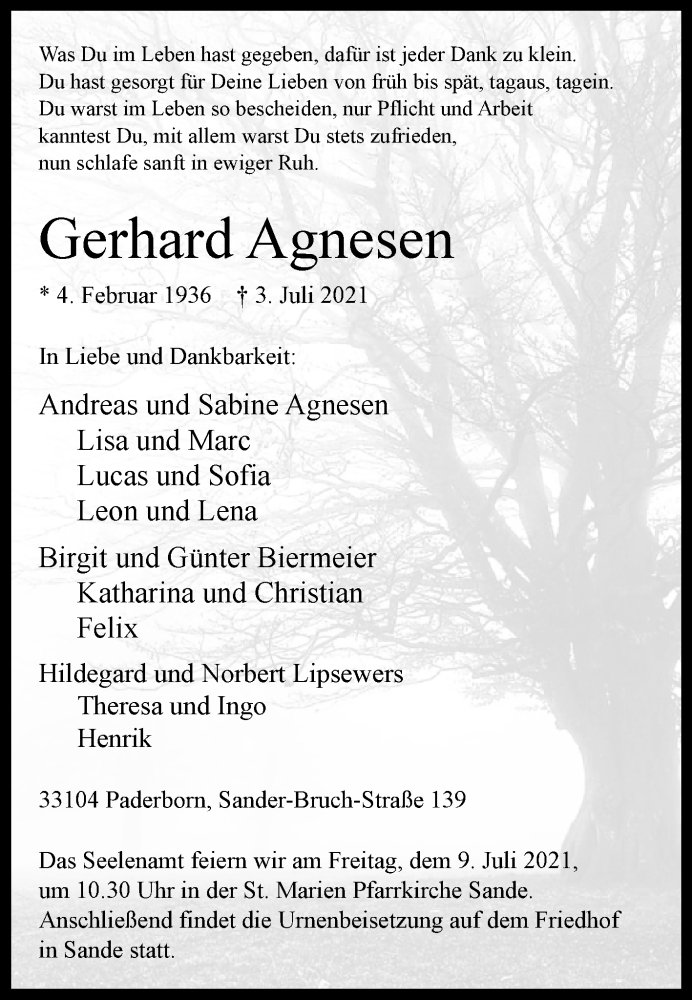 Hier finden Sie alle Traueranzeigen aus der Zeitung, die bisher für Gerhard Agnesen erschienen sind. Weitere Traueranzeigen, die in der Zeitung erscheinen, werden hier ebenfalls aufgelistet