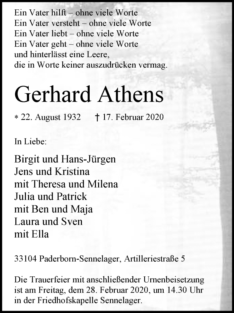 Hier finden Sie alle Traueranzeigen aus der Zeitung, die bisher für Gerhard Athens erschienen sind. Weitere Traueranzeigen, die in der Zeitung erscheinen, werden hier ebenfalls aufgelistet