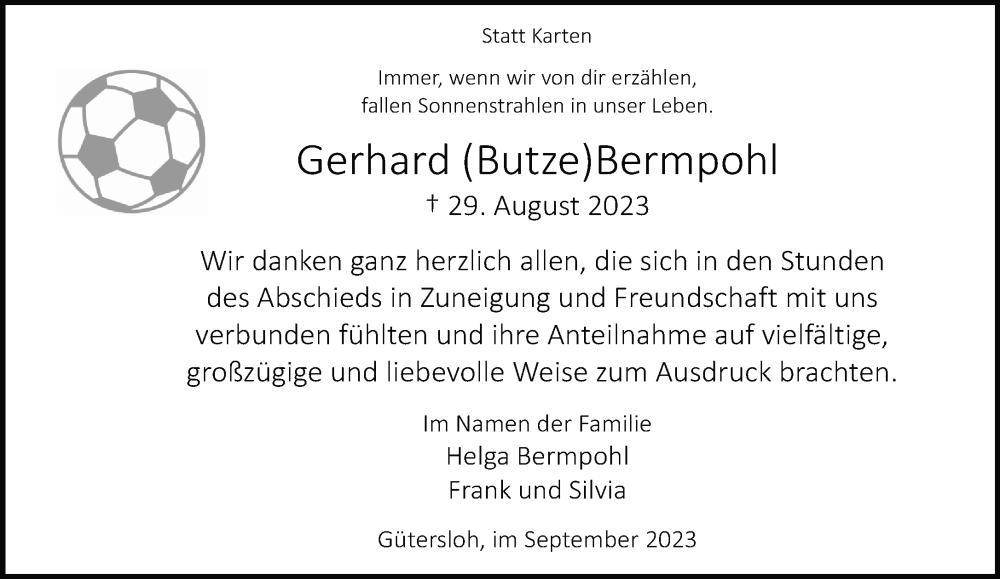 Hier finden Sie alle Traueranzeigen aus der Zeitung, die bisher für Gerhard Bermpohl erschienen sind. Weitere Traueranzeigen, die in der Zeitung erscheinen, werden hier ebenfalls aufgelistet