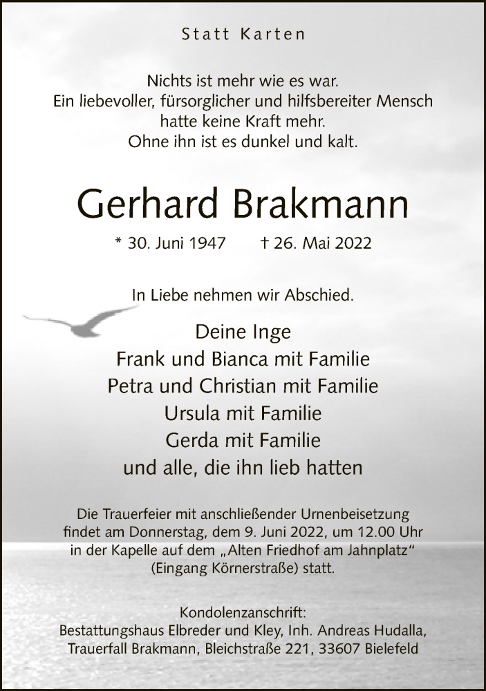 Hier finden Sie alle Traueranzeigen aus der Zeitung, die bisher für Gerhard Brakmann erschienen sind. Weitere Traueranzeigen, die in der Zeitung erscheinen, werden hier ebenfalls aufgelistet