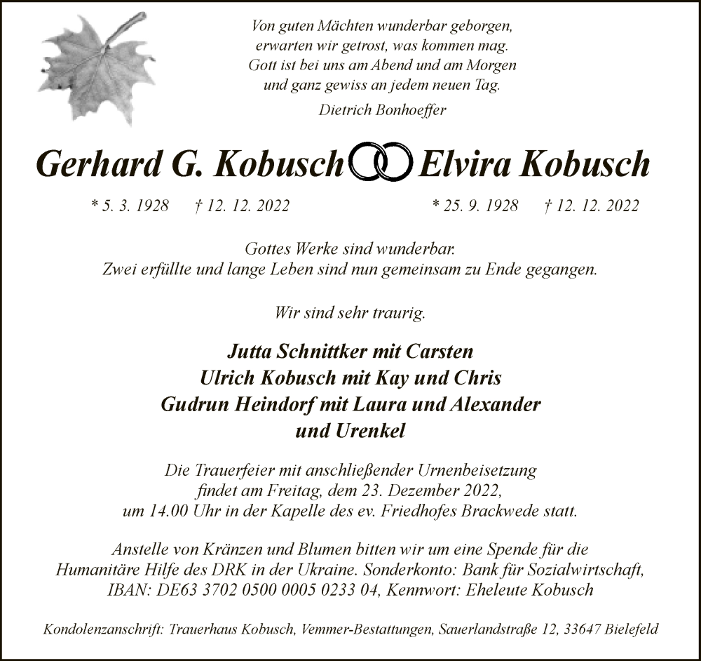 Hier finden Sie alle Traueranzeigen aus der Zeitung, die bisher für Gerhard G. und Elvira Kobusch erschienen sind. Weitere Traueranzeigen, die in der Zeitung erscheinen, werden hier ebenfalls aufgelistet