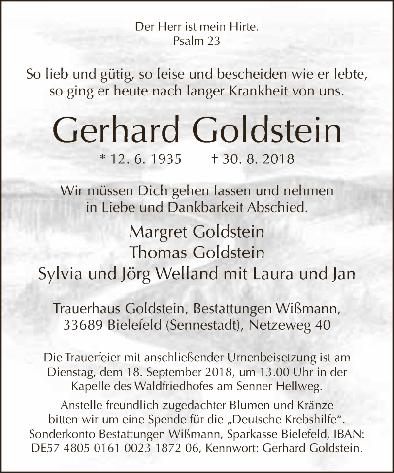 Hier finden Sie alle Traueranzeigen aus der Zeitung, die bisher für Gerhard Goldstein erschienen sind. Weitere Traueranzeigen, die in der Zeitung erscheinen, werden hier ebenfalls aufgelistet