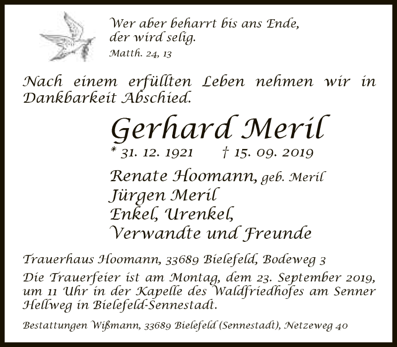 Hier finden Sie alle Traueranzeigen aus der Zeitung, die bisher für Gerhard Meril erschienen sind. Weitere Traueranzeigen, die in der Zeitung erscheinen, werden hier ebenfalls aufgelistet