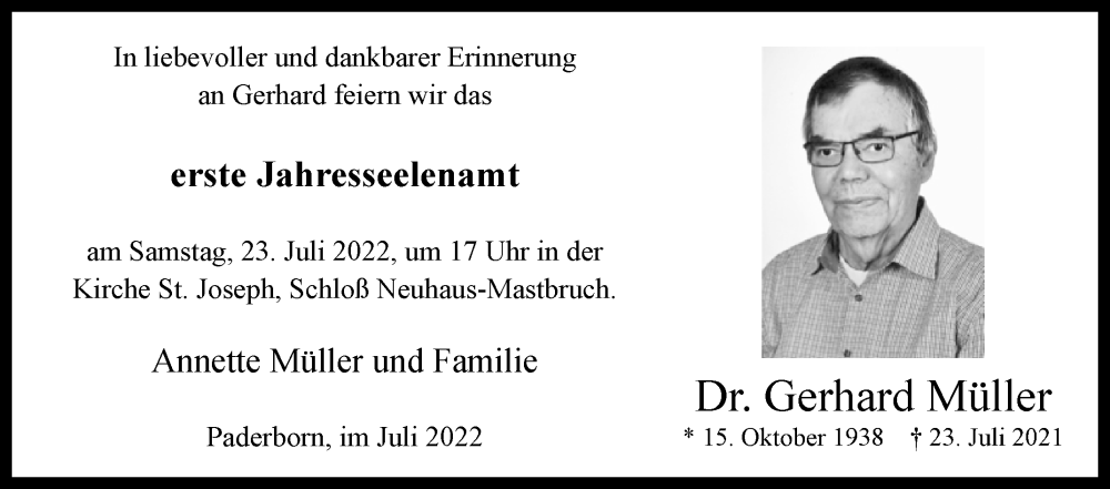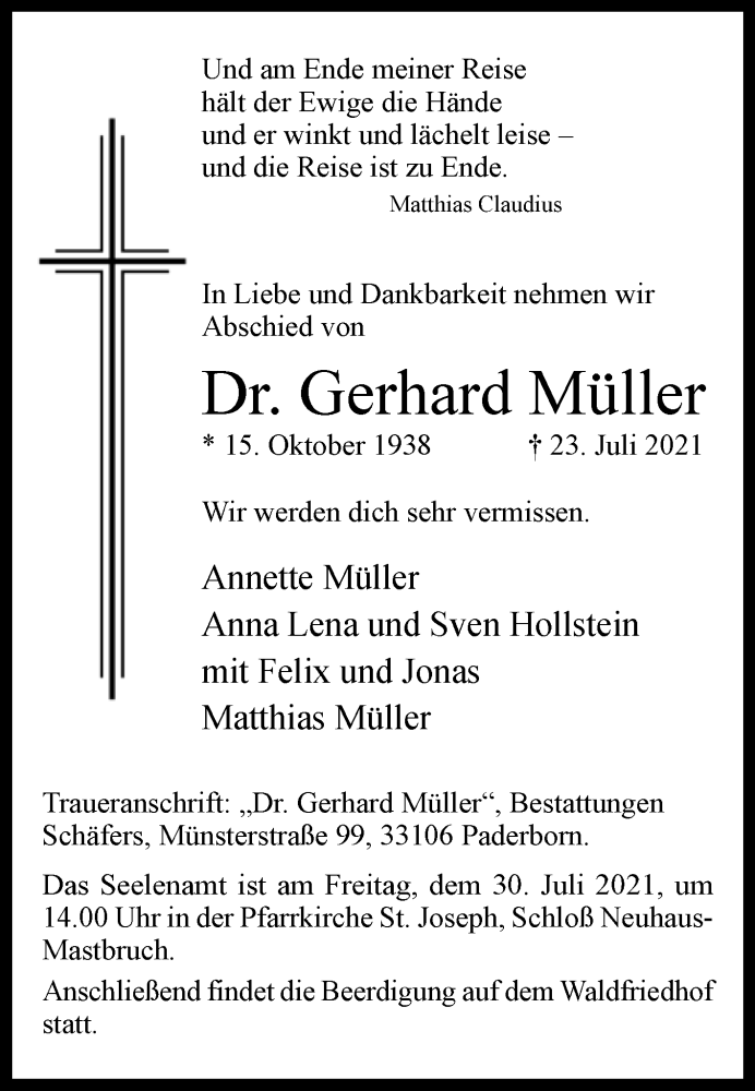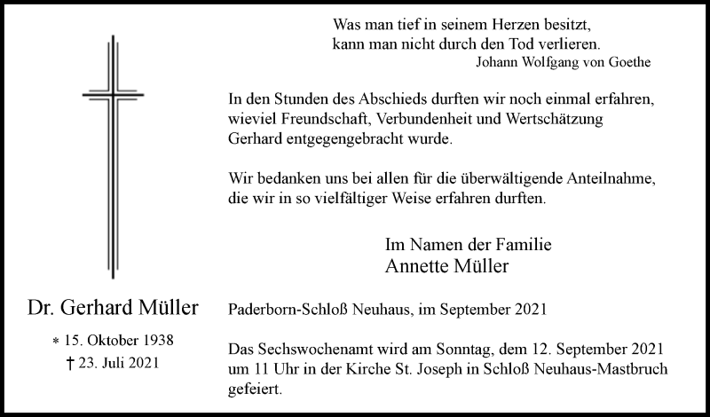 Hier finden Sie alle Traueranzeigen aus der Zeitung, die bisher für Gerhard Müller erschienen sind. Weitere Traueranzeigen, die in der Zeitung erscheinen, werden hier ebenfalls aufgelistet