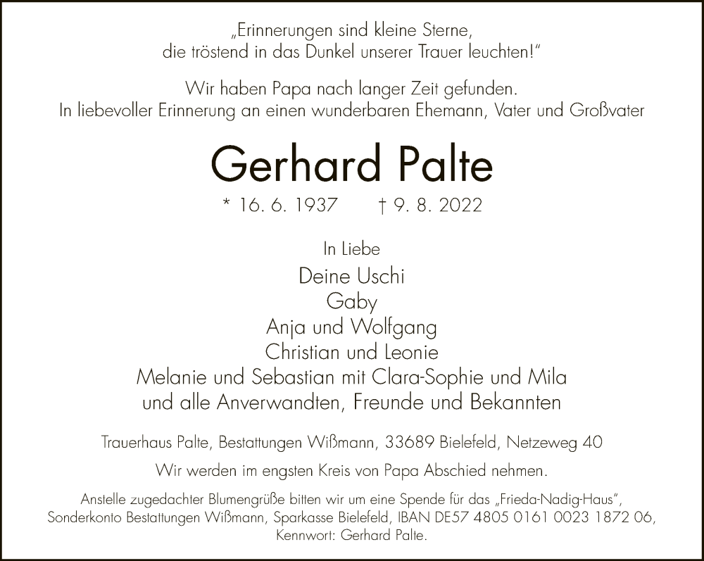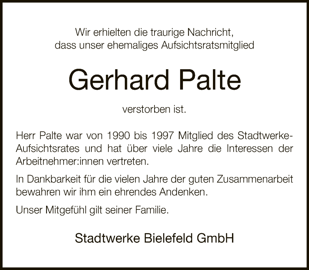 Hier finden Sie alle Traueranzeigen aus der Zeitung, die bisher für Gerhard Palte erschienen sind. Weitere Traueranzeigen, die in der Zeitung erscheinen, werden hier ebenfalls aufgelistet
