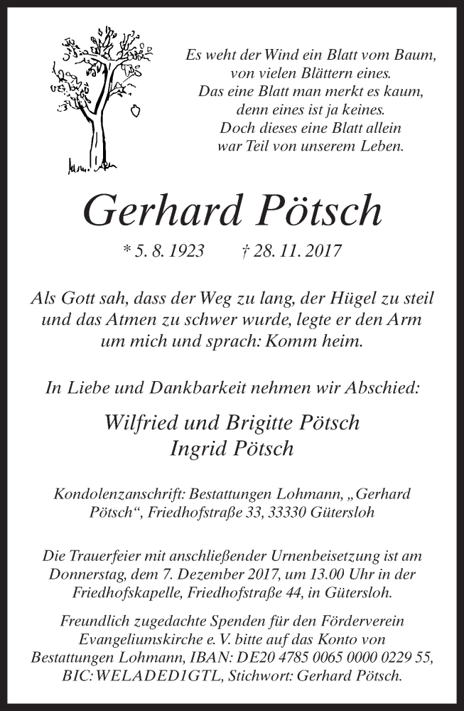 Hier finden Sie alle Traueranzeigen aus der Zeitung, die bisher für Gerhard Pötsch erschienen sind. Weitere Traueranzeigen, die in der Zeitung erscheinen, werden hier ebenfalls aufgelistet