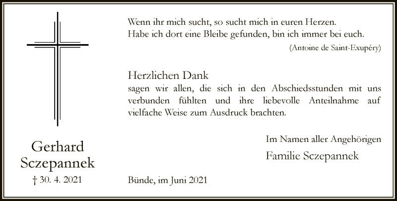 Hier finden Sie alle Traueranzeigen aus der Zeitung, die bisher für Gerhard Sczepannek erschienen sind. Weitere Traueranzeigen, die in der Zeitung erscheinen, werden hier ebenfalls aufgelistet