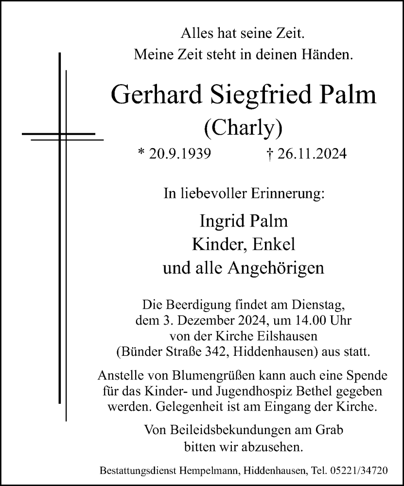 Hier finden Sie alle Traueranzeigen aus der Zeitung, die bisher für Gerhard Siegfried Palm erschienen sind. Weitere Traueranzeigen, die in der Zeitung erscheinen, werden hier ebenfalls aufgelistet