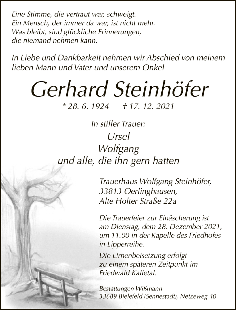 Hier finden Sie alle Traueranzeigen aus der Zeitung, die bisher für Gerhard Steinhöfer erschienen sind. Weitere Traueranzeigen, die in der Zeitung erscheinen, werden hier ebenfalls aufgelistet