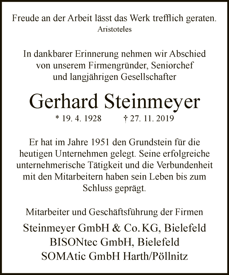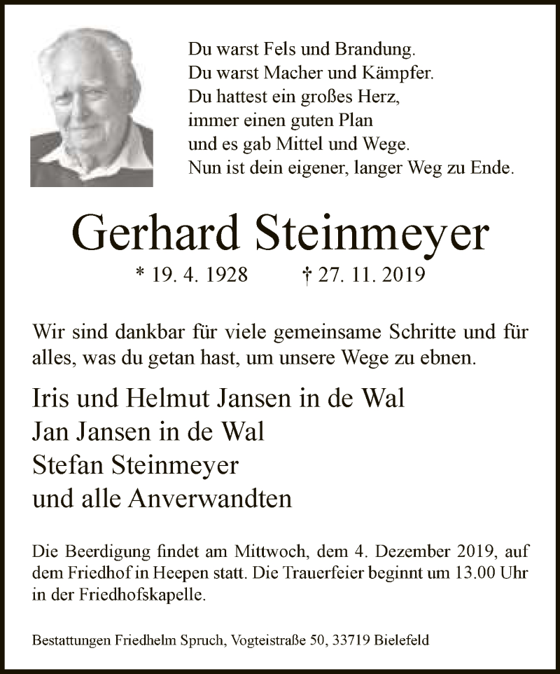 Hier finden Sie alle Traueranzeigen aus der Zeitung, die bisher für Gerhard Steinmeyer erschienen sind. Weitere Traueranzeigen, die in der Zeitung erscheinen, werden hier ebenfalls aufgelistet