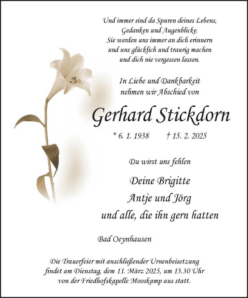 Hier finden Sie alle Traueranzeigen aus der Zeitung, die bisher für Gerhard Stickdorn erschienen sind. Weitere Traueranzeigen, die in der Zeitung erscheinen, werden hier ebenfalls aufgelistet