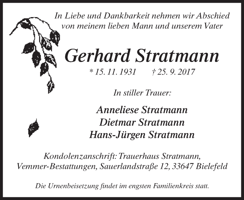 Hier finden Sie alle Traueranzeigen aus der Zeitung, die bisher für Gerhard Stratmann erschienen sind. Weitere Traueranzeigen, die in der Zeitung erscheinen, werden hier ebenfalls aufgelistet