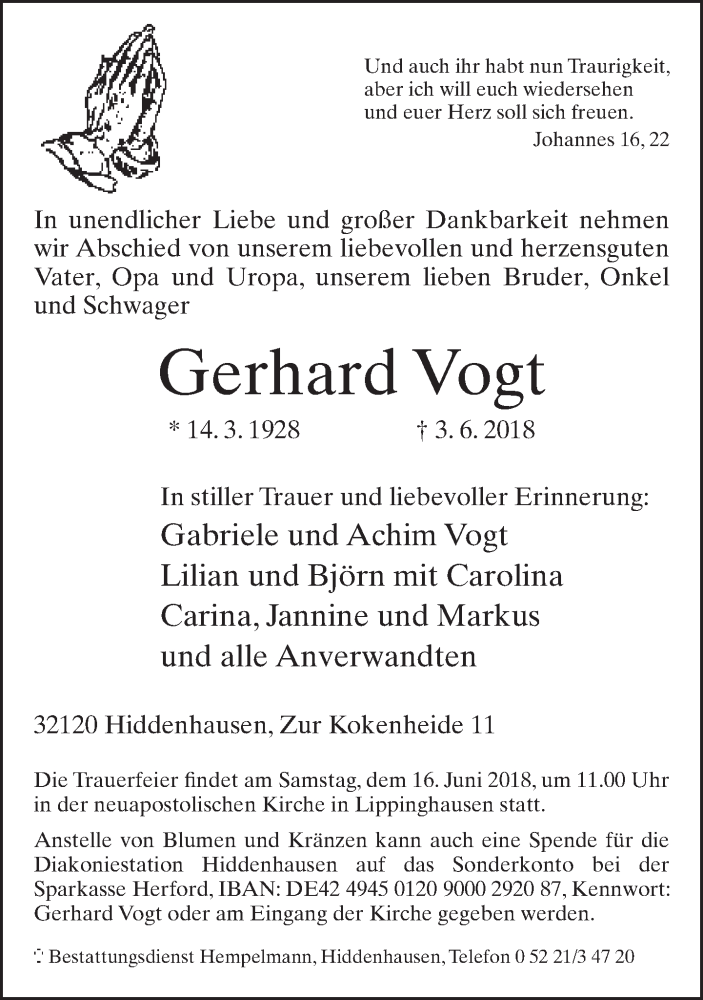Hier finden Sie alle Traueranzeigen aus der Zeitung, die bisher für Gerhard Vogt erschienen sind. Weitere Traueranzeigen, die in der Zeitung erscheinen, werden hier ebenfalls aufgelistet