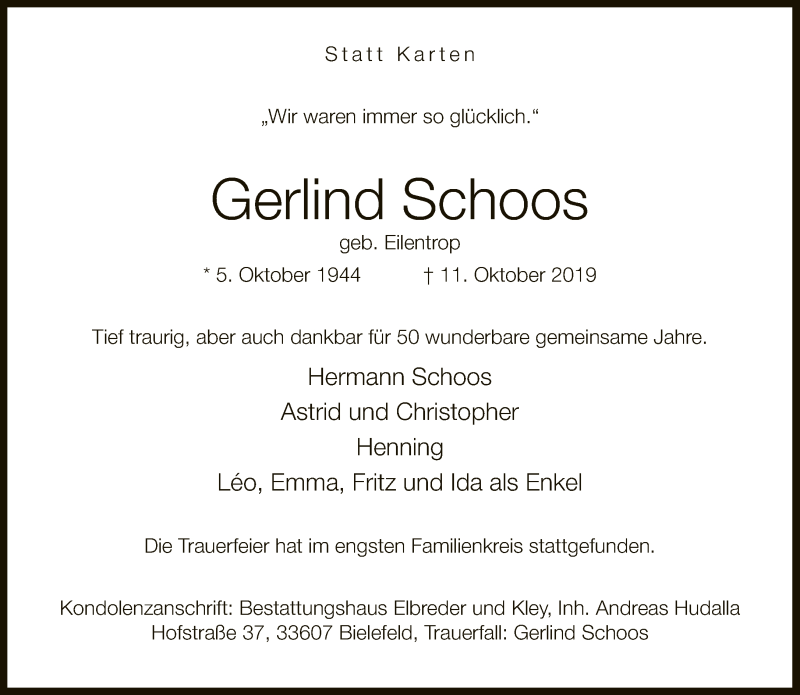 Hier finden Sie alle Traueranzeigen aus der Zeitung, die bisher für Gerlind Schoos erschienen sind. Weitere Traueranzeigen, die in der Zeitung erscheinen, werden hier ebenfalls aufgelistet
