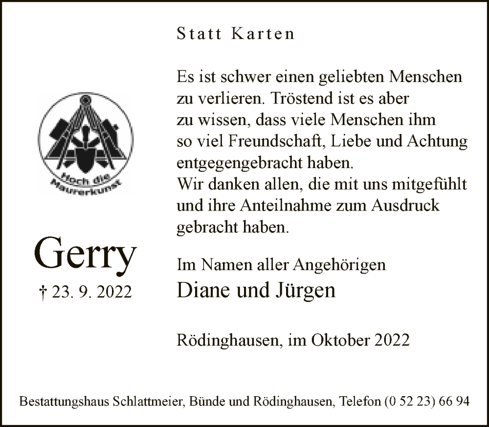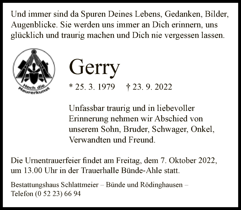 Hier finden Sie alle Traueranzeigen aus der Zeitung, die bisher für Gerry erschienen sind. Weitere Traueranzeigen, die in der Zeitung erscheinen, werden hier ebenfalls aufgelistet