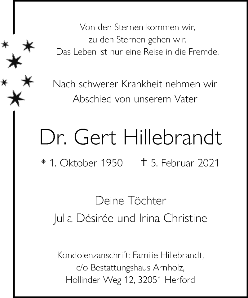 Hier finden Sie alle Traueranzeigen aus der Zeitung, die bisher für Gert Hillebrandt erschienen sind. Weitere Traueranzeigen, die in der Zeitung erscheinen, werden hier ebenfalls aufgelistet