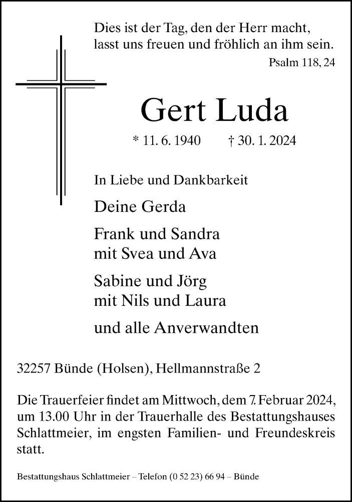 Hier finden Sie alle Traueranzeigen aus der Zeitung, die bisher für Gert Luda erschienen sind. Weitere Traueranzeigen, die in der Zeitung erscheinen, werden hier ebenfalls aufgelistet
